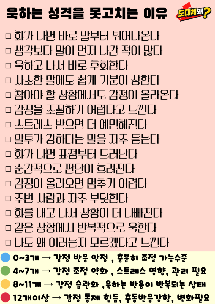 이 글에서는 욱하는 성격이 반복되는 원인과, 조금씩 바꿔갈 수 있는 방향을 함께 살펴보겠습니다.