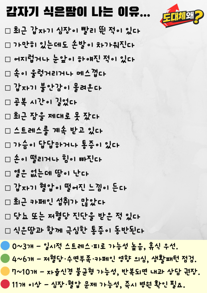 가만히 앉아 있는데도 등에 식은땀이 흐르는 느낌이 들 때가 있습니다. 덥지도 않은데 손바닥이 축축해지고, 이마에 차가운 땀이 맺히는 경험은 생각보다 많은 분들이 겪습니다. 순간적으로 “왜 이러지?” 하는 불안감까지 더해지면 몸보다 마음이 먼저 흔들리기도 합니다.