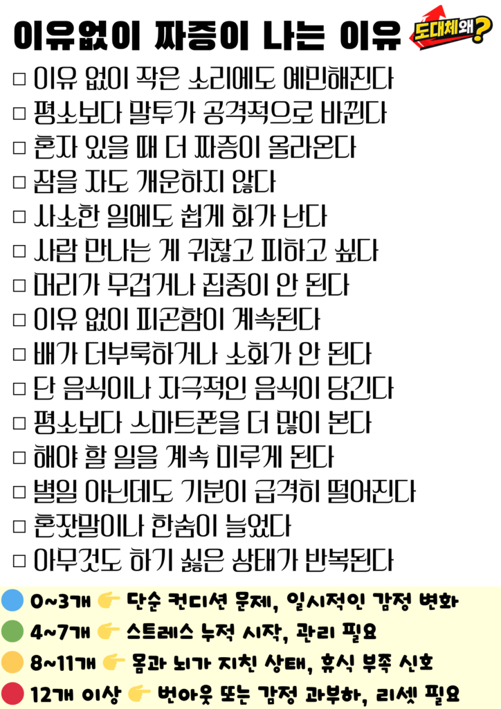 짜증은 갑자기 생기는 것이 아니라, 이미 쌓여 있던 피로와 스트레스가 드러나는 순간입니다.