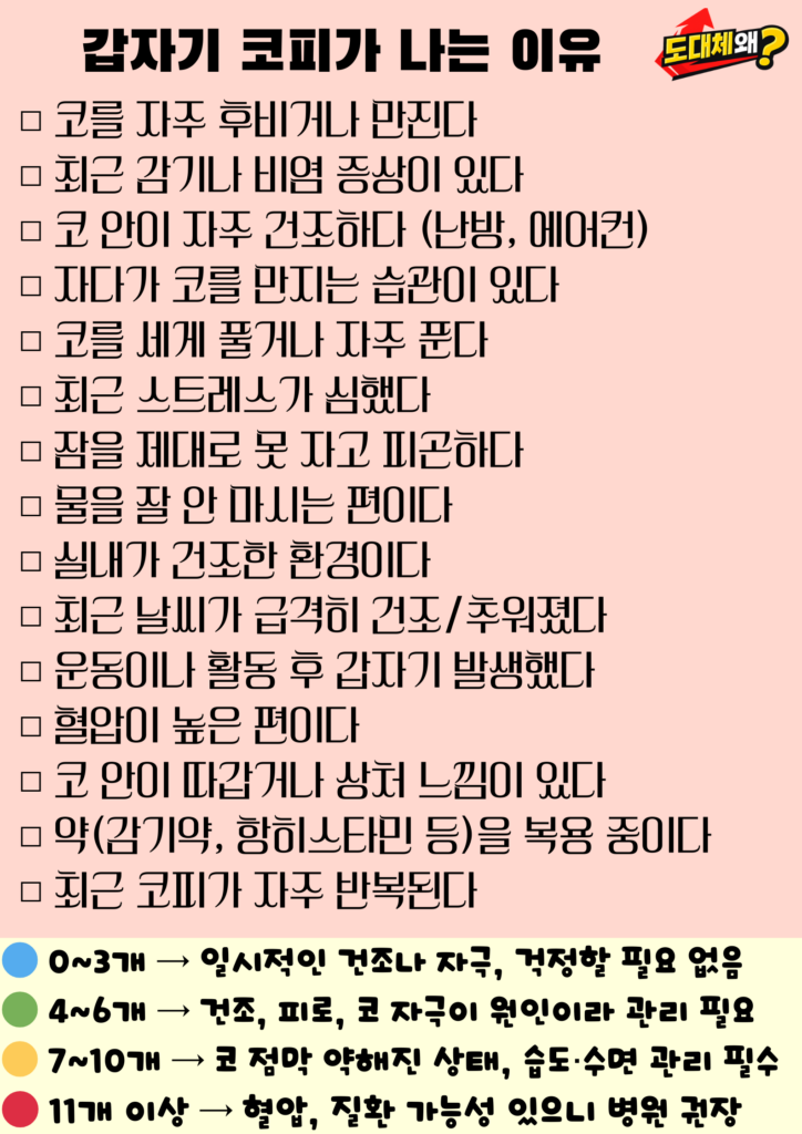 아래에서 갑자기 코피가 나는 주요 원인들을 차근차근 살펴보겠습니다.