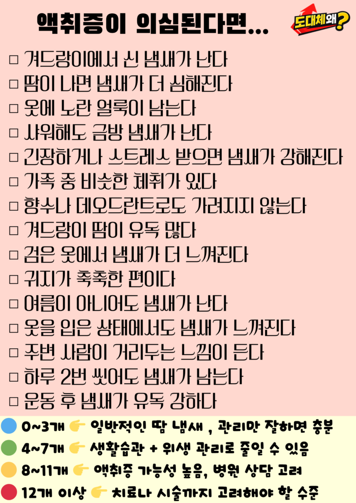 특히 씻은 직후인데도 냄새가 남아 있거나, 옷에 냄새가 배어 쉽게 빠지지 않는다면 단순한 체취가 아닐 수 있습니다.