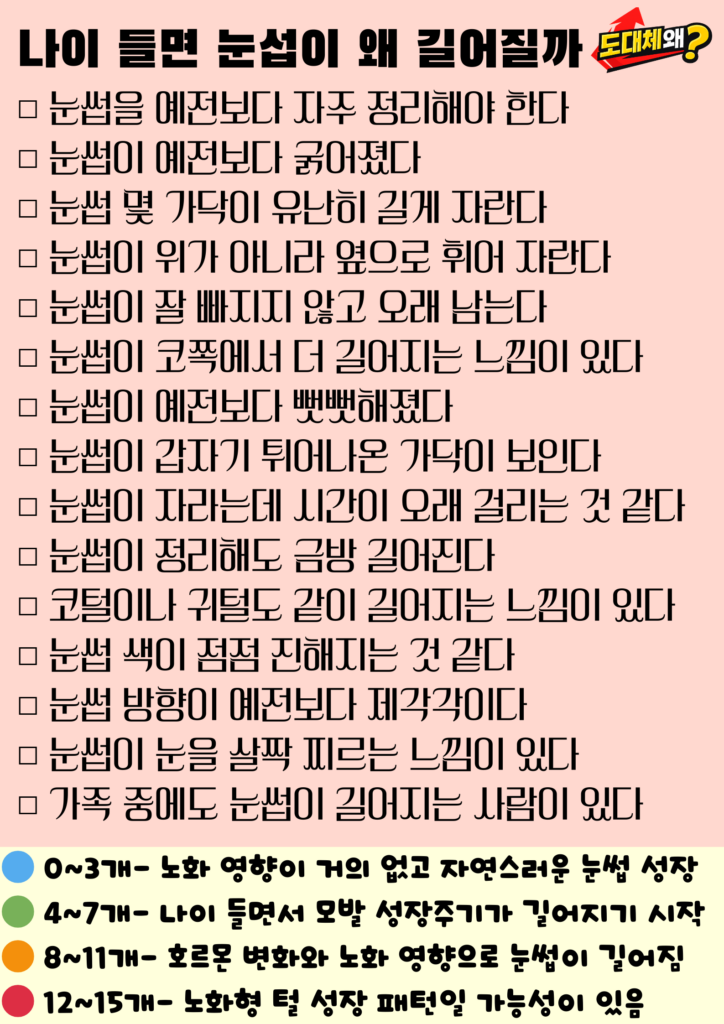 그래서 중년 이후에는 눈썹이 갑자기 길어졌다기보다, 예전보다 오래 자라게 된 것이라고 보는 것이 맞습니다.