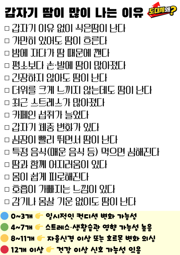 갑작스럽게 땀이 많아졌다면 단순한 습관 문제가 아니라 몸의 변화 신호일 가능성도 고려해보는 것이 중요합니다.