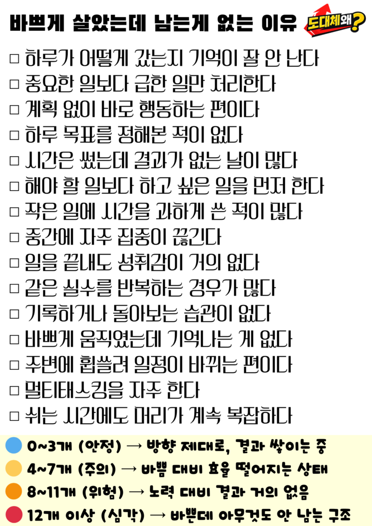 하루 종일 움직였는데도, 막상 돌아보면 남은 게 없다고 느끼실 때가 있습니다. 분명히 시간은 충분히 쓴 것 같은데 결과는 흐릿하고, 성취감도 따라오지 않습니다. 이런 경험은 누구나 한 번쯤 겪어보셨을 것입니다.