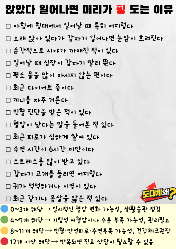 앉았다 일어날 때 머리가 핑 도는 현상은 생각보다 흔하지만, 반복된다면 그냥 넘길 문제는 아닙니다.