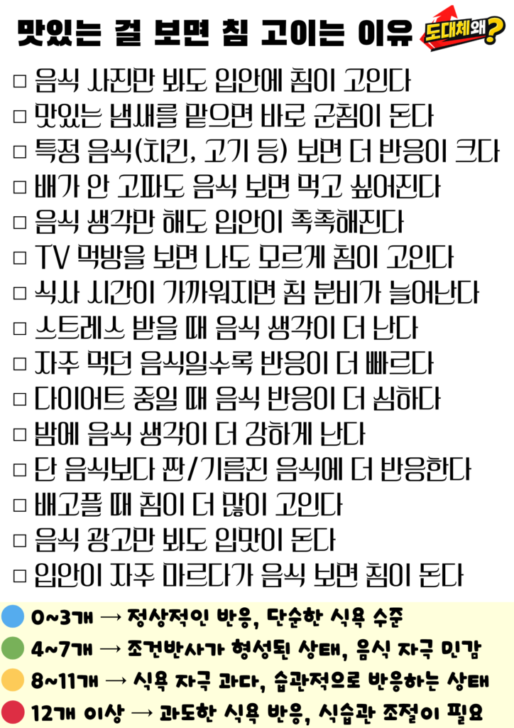 이 반응 자체는 건강한 신호이며, 문제가 되는 상황은 아닙니다. 다만 이런 자극이 반복되면 불필요한 식욕으로 이어질 수 있기 때문에, 음식 자극을 조절하는 것도 필요할 수 있습니다.