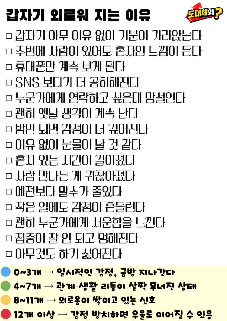 외로움은 갑자기 생긴 것이 아니라, 이미 쌓여 있던 감정이 드러난 순간일 가능성이 큽니다.