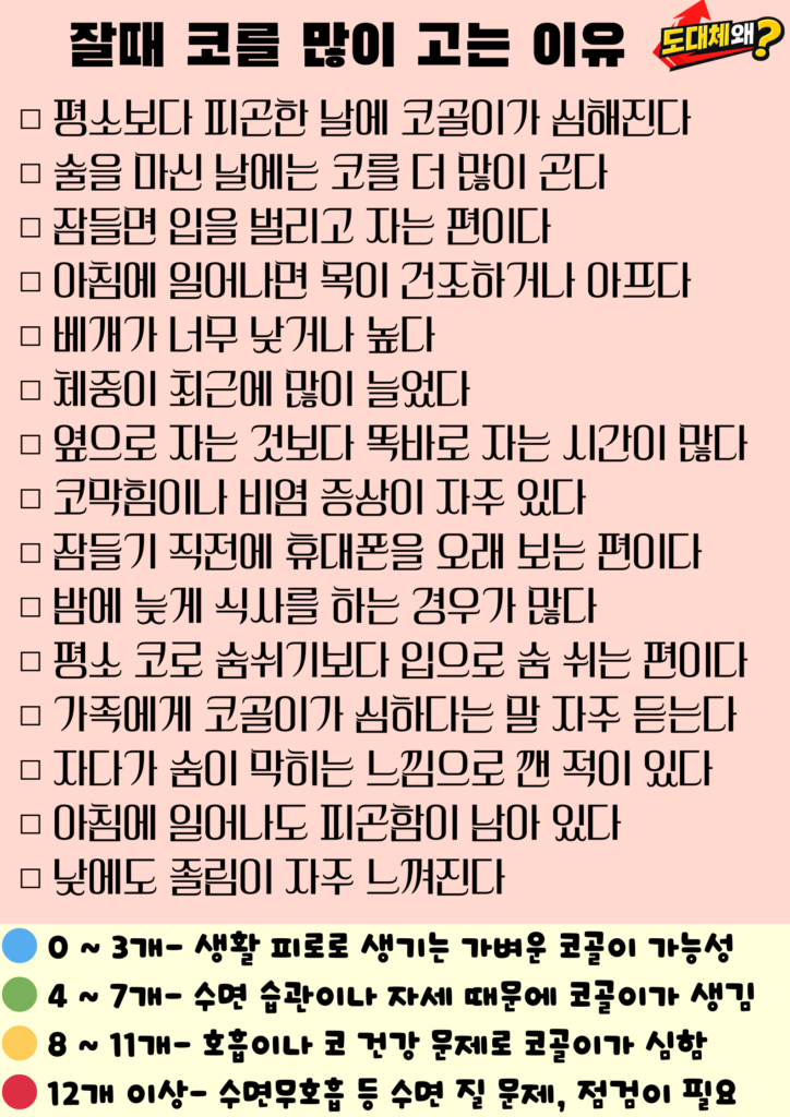 다만 코골이가 매우 심하거나 자다가 숨이 막히는 느낌이 반복된다면 수면 환경이나 생활 습관을 점검해 보는 것이 도움이 될 수 있습니다.