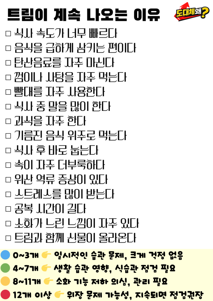 문제는 이 과정이 과도하게 반복될 때입니다. 단순한 식습관 문제일 수도 있지만, 위장 상태나 생활 습관이 영향을 주는 경우도 많습니다.